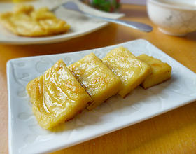 平底锅放一点点油,将蒸好的糯米饼用小火略煎