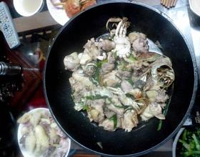 鸡半熟时下毛蟹,番炒,放酒,盐,糖,鸡精,酱油,加盖焖一下