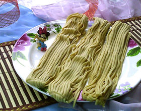 面粉和液体混合搅拌的时候一定不能过度搅拌,变成大颗粒状就可以压面了,否则变成面团就不容易被压出了。最后的成品面条可以根据自己的喜好剪成适宜的长短。