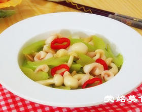 加炒好的鱿鱼、红辣椒、糖、一点点酱油翻炒,加入香油翻炒均匀即可