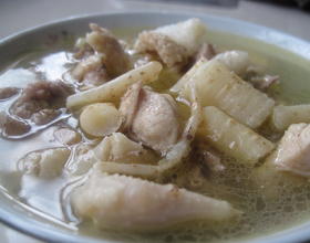 - 3. 把鸡切块放入锅里煮,把血沫煮去,再把臭参放放汤里一起煮