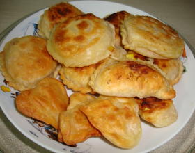 - 6. 取两片相同形状的面皮,中间包入玉米陷,四边锁边。