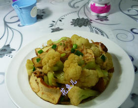 - 7. 烧锅倒油烧热,下入焯熟的花菜翻炒一下。