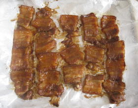 再烤盘上放锡纸再放层油纸将腌制好的五花肉码再烤盘上放入烤箱。