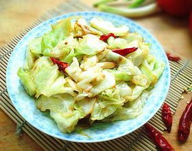 倒入包菜,翻炒片刻后烹入醋,生抽,盐快速翻炒。