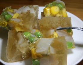 - 3. 另备豌豆焯水,焯熟不变色即可,放进融好的皮冻汤中。
