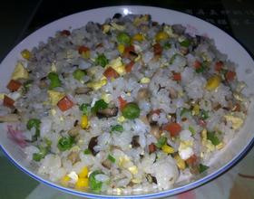- 9. 倒入米饭,同时加入煎好的鸡蛋,翻炒均匀;