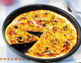 - 6. 披萨盘刷一层油,用手将面团摊开在盘里,用叉子戳些孔;