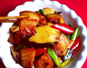 - 7. 再将蒜苗辣椒加入拌炒。