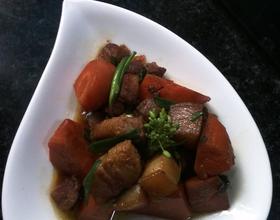 炒好的五花肉,把多余地油舀出,下入生姜片翻炒之香,加入生抽30ml。