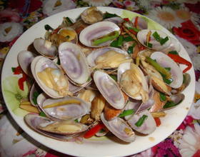 - 4. 辣椒葱白和姜先放锅爆炒,下滤干水的花蛤一起翻炒,下些酒去腥味,用大火炒。