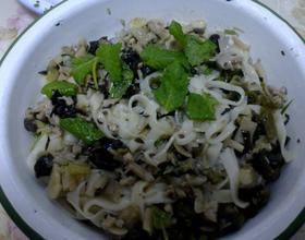 煮锅烧水,将手擀面煮好.拌入杂菌做的卤最后撒些薄荷在上面.开吃喽
