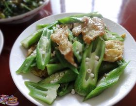 - 6. 3.秋葵入锅炒至变色,可以略加一点水,不然秋葵自身的粘液会不好炒、