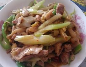 放入食盐肉色变白时加入西芹,青椒,加入生抽和干辣椒
