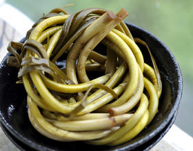 - 10. 把蒜薹捆码放到干净无油无生水的容器里,倒入晾凉的料汁,没过蒜薹。