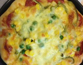 - 4. 开始放各种材料,看自己喜好了,我放的是披萨专用肠和牛肉粒,加了点菠萝提味,还有甜玉米粒以及青豆,撒上芝士,进烤箱了,大概20分钟之后就OK啦,也可以在临出烤箱前再放点芝士,。完成啦!