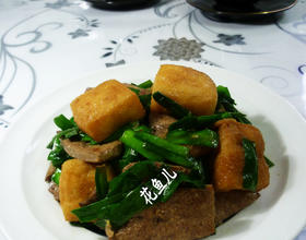 - 11. 烧锅倒油烧热,下入切开的油豆腐和焯好的猪肝翻炒一下。
