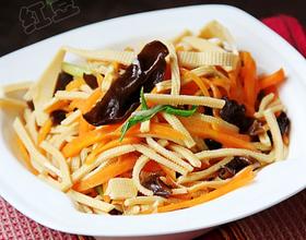 豆腐丝用开水先煮一下,即可除去豆腥味,也能缩短炒制的时间。