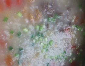 虾仁和姜放入锅中焖煮10分钟,之后放入事先煮好的粳米。待开始锅再次沸腾,放入番茄和事先腌制好的牛肉,大火煮沸,放入葱,起锅。