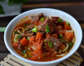 2:牛肉面放上青蒜苗和辣椒油更提味。