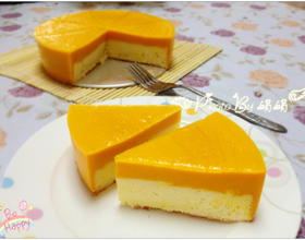 - 14. 将QQ糖溶液浇在冻好的南瓜慕斯表面,再放入冰箱冷藏至镜面结冻,脱模