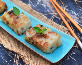 - 10. 取出放凉后脱模,切成块状,吃时放入平底锅煎制,煎至双面金黄微焦,佐以XO酱食用