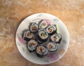 用刀把紫菜包饭切成一小块一小块的。差不多两厘米一个紫菜包饭就可以了。
