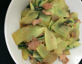 油燒熱、放入薑片、蒜塊爆炒出香味倒入肉片翻炒至六分熟,其次先把青笋片倒入一起大火炒2-3分鐘斷生,再將青笋葉倒入鍋中翻炒2分鐘,放鹽,雞粉翻炒熟即可入盘。