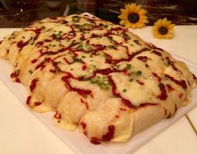 烤制25分钟左右,柔软、咸香的芝士排包便制作完成了。看!细腻的切面,是不是有点诱人?