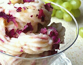 用裱花将土豆泥做成造型,然后浇上糖玫瑰(超市有卖糖玫瑰)