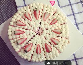 脱模方法:把模具放在杯子上悬空然后用热毛巾包着模具捂下,或者用电吹风稍微吹下,模具会神奇的往下掉,蛋糕外围也会很整齐的!这个蛋糕用的是六寸活底模我在上边放了一层棉花糖然后摆上草莓不仅美观而且美味