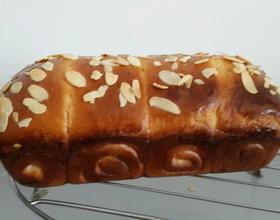 - 10. 放入烤箱进行第二次发酵60分钟,面团发到模具的八九分高,刷上蛋液撒上少许的杏仁片。