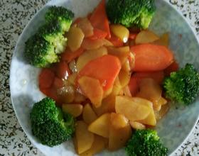 热锅凉油放入蒜片,翻炒至微黄出香味,倒入土豆胡萝卜,炒至微黄酥软时加入耗油翻炒均匀即可出锅装盘!