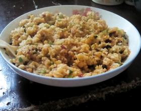 倒油进锅,油热后,倒入米饭,随后倒入鸡蛋液,翻炒5分钟