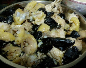 把鸡肉、木耳和姜蒜放到蒸笼里,再把蒸笼放到锅里隔水蒸。P.S.锅里这时可以煲汤水哦