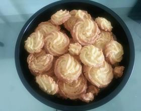 将温热的面糊装入剪口,装好裱花头的裱花袋,快速挤在油纸上。180度上下火20分钟即成。