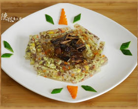 - 4. 将做法1五彩冻条切条与做法2拌一起,盛盘淋上姜汁酱油即可