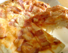 - 5. 将面团用手压平(或用桿面棍亦可)成圆饼状,放上烤盘,涂上番茄酱,洒上起司及披萨馅料