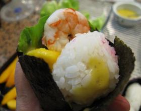 将手沾醋水把寿司饭捏成小长丸 - 5. 将芒果去皮切长条