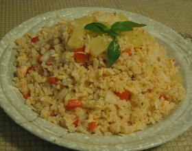 起油锅爆香洋葱及红甜椒,加入鲑鱼松及隔夜饭以中小火拌炒均匀,以盐,胡椒粉,意式香料粉调味,最后再加入凤梨片翻炒即可