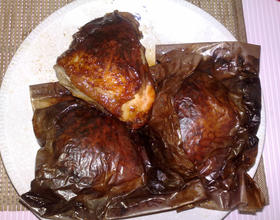 腌制的鸡肉,放进油纸袋,加入适量的葱段和姜。[不喜欢的,可选择不放]。再用钉书机钉住袋口。