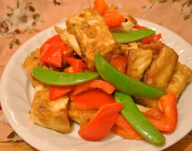 板豆腐,表面沾点面粉,下锅油炸,金黄就可以起锅。