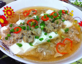 将水豆腐取出洗净,切厚片排在碟子上,然后补上腌制好的肉碎,和辣椒圈。