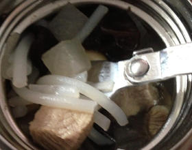猪小排、萝卜、海带、干贝、黑木耳、姜片、大蒜瓣、粗米粉置入焖烧罐中,注入滚水预热3分钟后,把水倒掉。