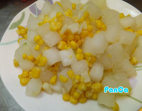 先下姜末爆香,接着加入冬瓜、玉米粒...盐巴一起拌炒。 - 6. 盛盘,上菜!!!!
