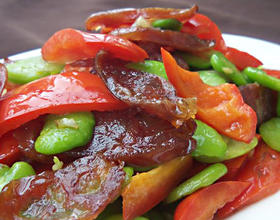 所有材料洗好,腊肠和红椒切片,蚕豆去壳去皮捏成豆瓣,蒜切片。