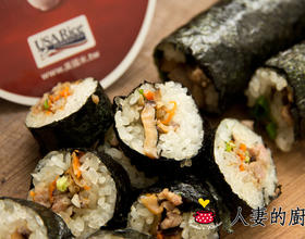 - 3. 摊开整张海苔,将美国加州圆糯米置于海苔3/1处舖平后,再将绞肉及香菇、红萝卜摆放长条,然后慢慢卷起,然后切块即可。(因为没有竹帘,所以用保鲜模,用其黏在桌面上的拉力来卷,较少力些)