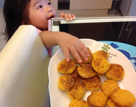 把地瓜面团搓成小球,压成小圆饼,表面以叉子搓洞。以气炸锅或烤箱170度烤20分钟,表面呈金黄色即可。