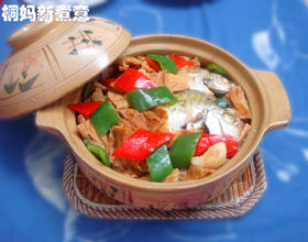 到水略干的时候,看见只剩下一点汁,揭开沙煲盖,放上青红辣椒,关火盖上盖子焖2分钟即可。