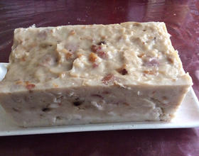 - 6. 煮至粉浆可托住馅料的程度,倒入抺油的容器,若有预留馅料此时可撒在上面,大火蒸约50分钟,蒸好后面上若有出水要倒掉水分。